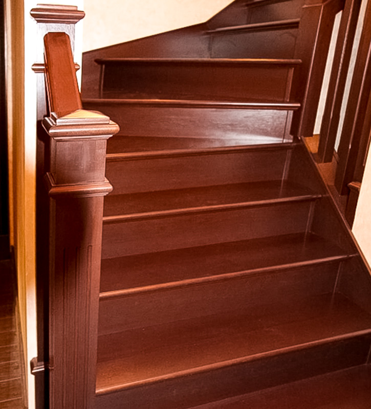 Забежные ступени для удобного подъёма. Высота и ширина — регулируемые. Деревянные перила гарантируют безопасность и комфорт.