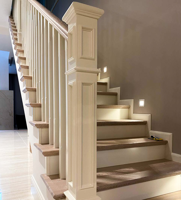 Прослужит не одно десятилетие, сохраняя изначальную красоту при минимальном уходе. Ступени отгорожены от стены декоративным плинтусом. Удобный скругленный поручень облегчает спуск и подъем.