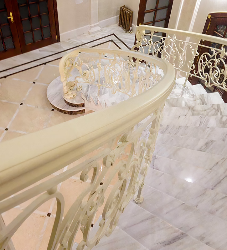 Лестница ЛМ 10 выполнена из натурального мрамора с особым «мокрым» блеском. Резные перила и балясины тоже мраморные. Такая лестница — украшение дома. Часть его архитектурного ансамбля. Образец изящного дворцового стиля для просторных загородных домов и двухуровневых квартир.