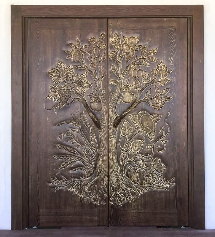 Крупный рисунок объединяет обе створки, он вырезан вручную мастером-краснодеревщиком. Растительный мотив с деревом, как центральным элементом, раскрывает щедрость природы и посвящен богатому урожаю.