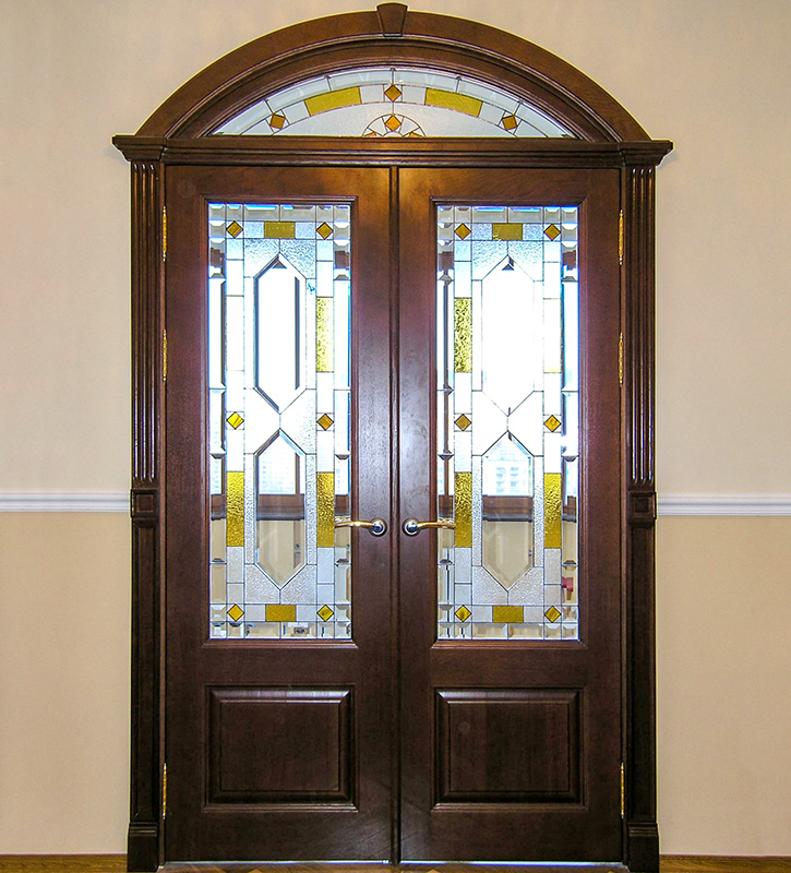 Двустворчатая межкомнатная дверь ДМ 39 из массива дерева со стеклянными вставками, арочным витражом и резными наличниками в классическом стиле. Насыщенный темно-коричневый цвет и фактурная поверхность подчеркивают структуру древесных волокон. Могут быть подогнаны под разную ширину проема. Витражные стекла свободно пропускают свет, сохраняя ощущение простора даже в сравнительно небольших помещениях.