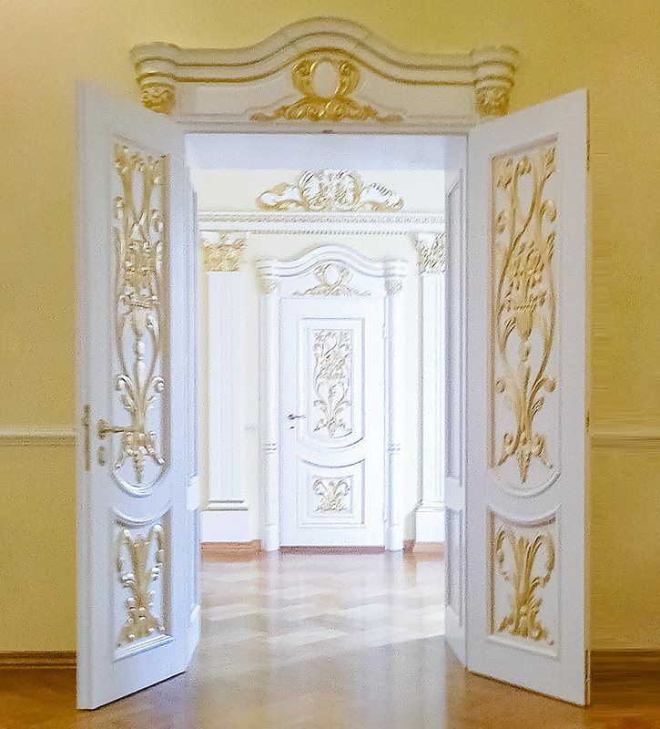 Двустворчатые двери ДМ 33 в классическом версальском стиле с изысканными золочеными орнаментами. Резные вензеля замысловатых форм украшают роскошный широкий карниз, полотна створок декорированы естественными природными узорами. Традиционно за основу фона взят белый цвет, на котором контрастно выделяется позолота. Наличники выполнены в виде барельефов колонн с аккуратными пилястрами со сглаженными углами.