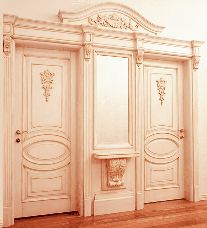 Двери из массива дерева ДМ 01 с резьбой по наличникам и дверному полотну. Такая же резьба может быть изготовлена для других декоративных элементов интерьера: пилястры, арочные своды, филенки и т.д. Наши мастера «Бел-Мастер» готовы проконсультировать вас по всем вопросам, связанными с нашей продукцией и ее эксплуатацией.