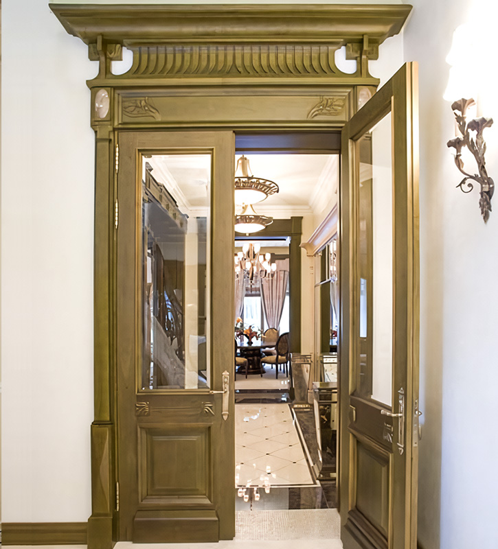 Роскошные двустворчатые двери ДМ 04 со стеклянными вставками, выполненные из массива дерева в классическом стиле. Наличники выполнены в виде колонн на прямоугольных стилобатах с фигурной базой, верхний карниз выполнен в форме пилястры с широким выступом. Цвет – зелено-золотистый, с прозрачными стеклянными вставками в полотнах. Это отличное решение для музейных интерьеров, отелей и ресторанов, административных помещений.