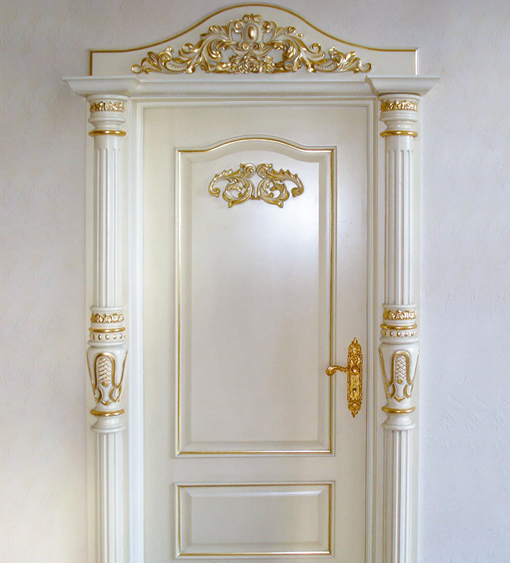 Роскошная межкомнатная дверь ДМ 23 в классическом стиле с версальскими элементами в виде позолоченных карнизов, вензелей и полуколонн. Эта модель выполнена в приятном белом цвете, который дополнительно визуально расширяет внутренний объем помещений. Двери подойдут, как для частных коттеджей или квартир премиум-класса, так и для административных объектов.