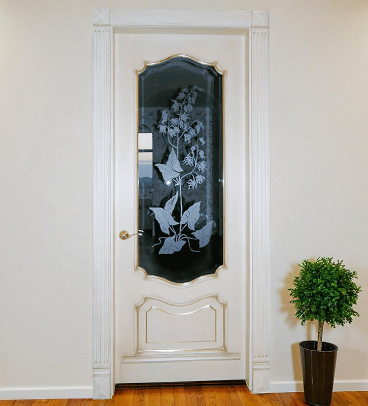 Межкомнатная дверь из массива дерева ДМ 14 в классическом стиле со стеклянной полупрозрачной вставкой. Оформлена резными наличниками, позолоченными штапиками и галтелями, стекло украшено изображением с натуралистическим сюжетом. Дверь подойдет для установки в кухне, детской комнате. Белый цвет помогает визуально расширять пространство в помещениях с низкими потолками.
