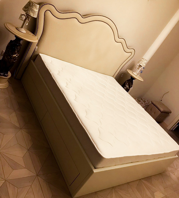 Двуспальная кровать с фигурным изголовьем КРМ 08 с прочным каркасом из массива дуба – отличный вариант для спальни в винтажном, классическом, стиле рококо или ампир. У нее изящный дизайн без лишних деталей, за счет чего модель хорошо смотрится и в современном интерьере. Мы занимаемся производством мебели из натурального дерева, изготовим двуспальную кровать нужных параметров по индивидуальному проекту.