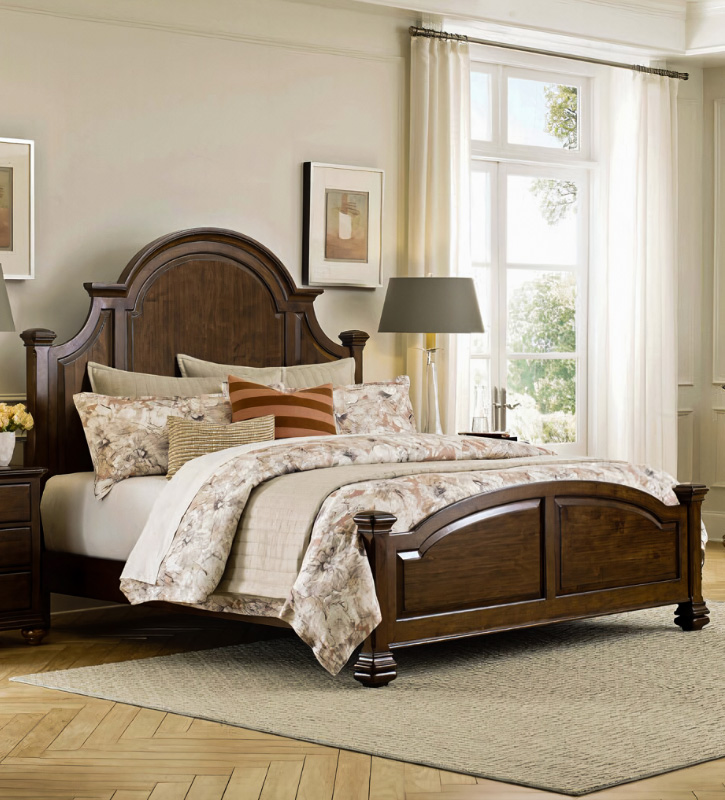 Красивая двуспальная кровать КРМ 35 из массива ольхи шоколадного цвета с фигурным изголовьем и изножьем, резными ножками – настоящее украшение интерьера. Модель идеально подходит для спален в стиле ампир, барокко, классика. Изготовим кровать по индивидуальным проектам и эскизам под ваши размеры в кратчайшие сроки, интерьер из натурального дерева из нашего каталога.