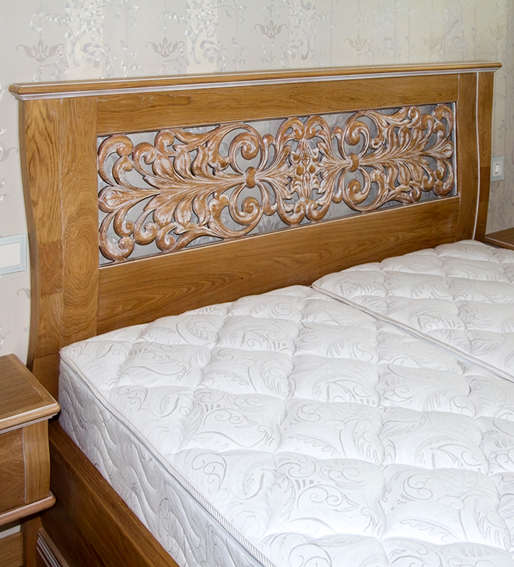 Кровать КРМ 21 из массива дуба станет украшением любой спальни. Изящная резьба в изголовье придает мебели элегантность. Основание кровати довольно глубокое, благодаря чему на него можно положить матрас любой высоты. В изножье у этой модели предусмотрена стенка. Она не дает смещаться матрасу.